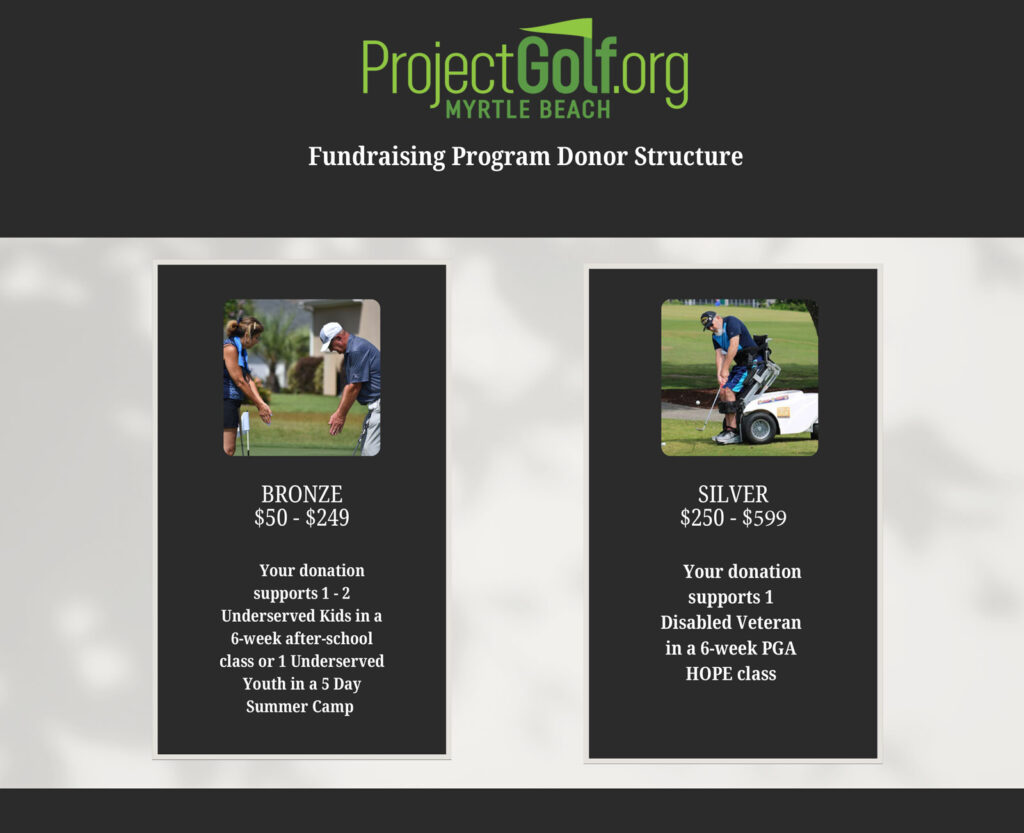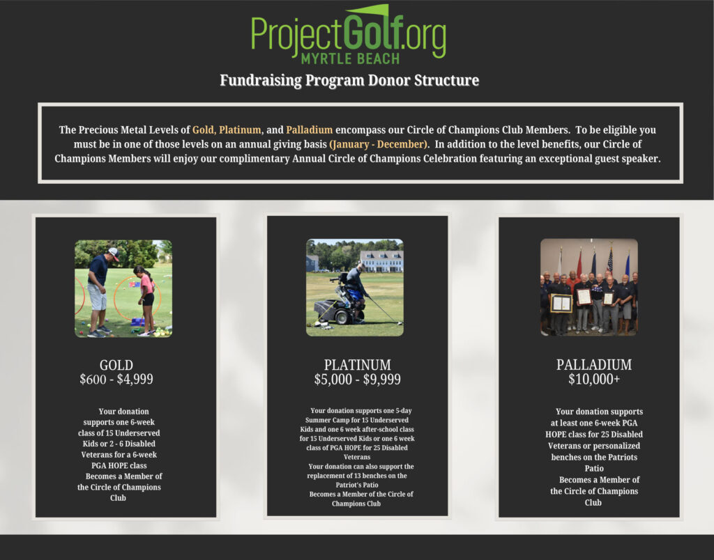As a non-profit 501(c)3 organization supporting our Disabled Veterans get back into the community through Adaptive Golf or supporting our Underserved Youth through mentoring and the values of golf, Project Golf values our Individual Donors. Previously on our website, you have seen how our programs have impacted those that we serve. If you would care to support our cause through your donation, whether it be one-time or a monthly contribution, please see our levels below. You may also contact Jack Lutz at jacklutz2@projectgolf.org or (610) 608-5152. We greatly appreciate your support!